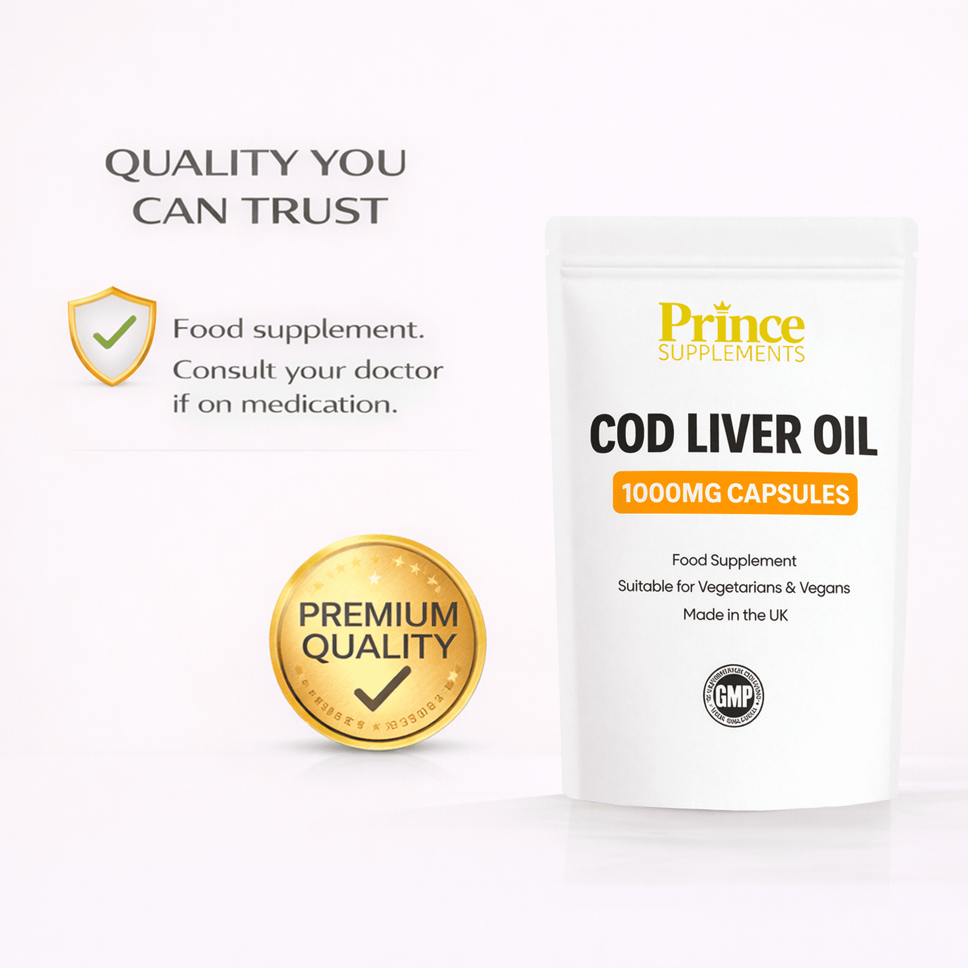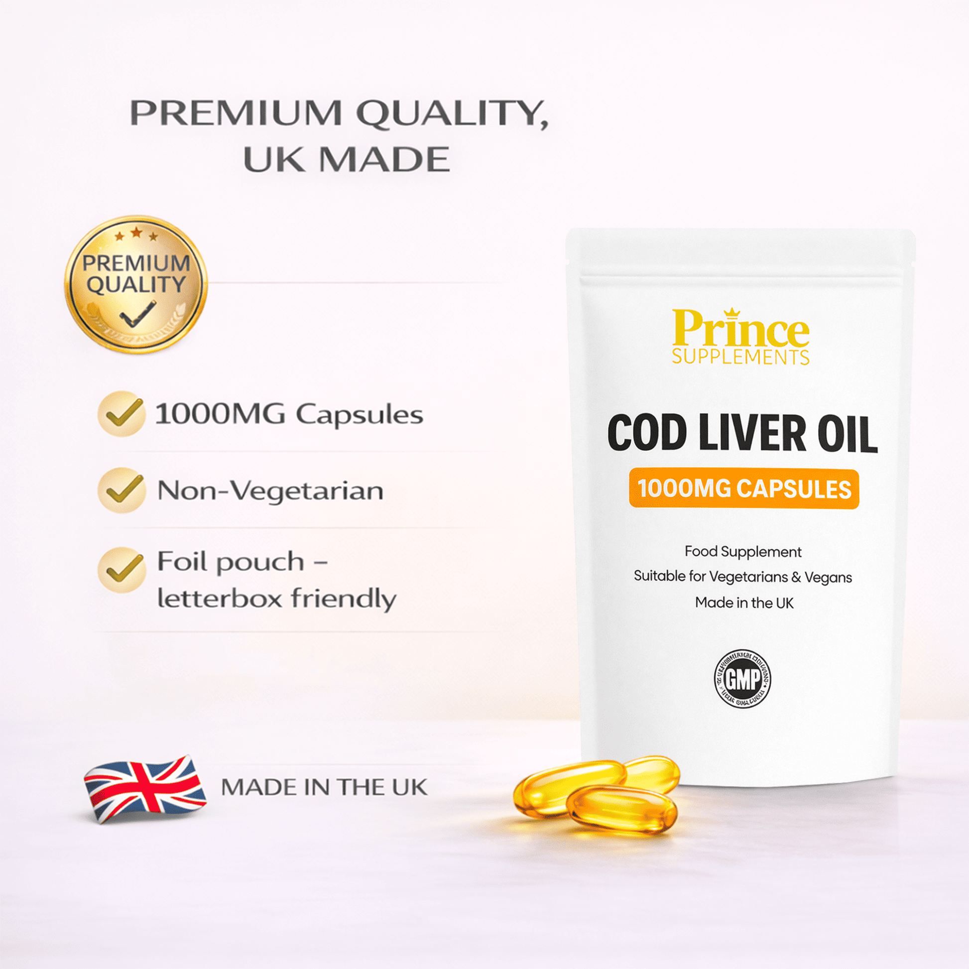 Premium quality Cod Liver Oil 1000mg capsules in a letterbox friendly foil pouch, designed to support everyday health and wellbeing.