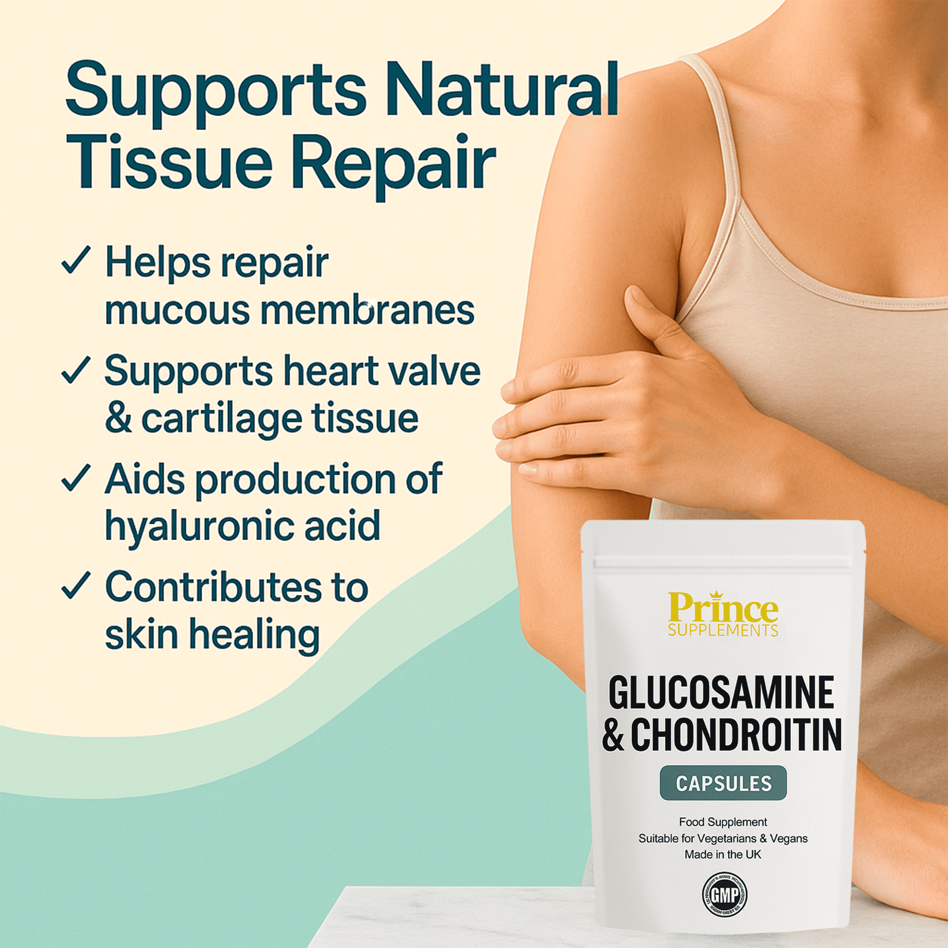 Glucosamine is used by the body to repair damaged tissues like cartilage, heart valves, mucous membranes and synovial fluid - the jelly-like substance that fills the joints.