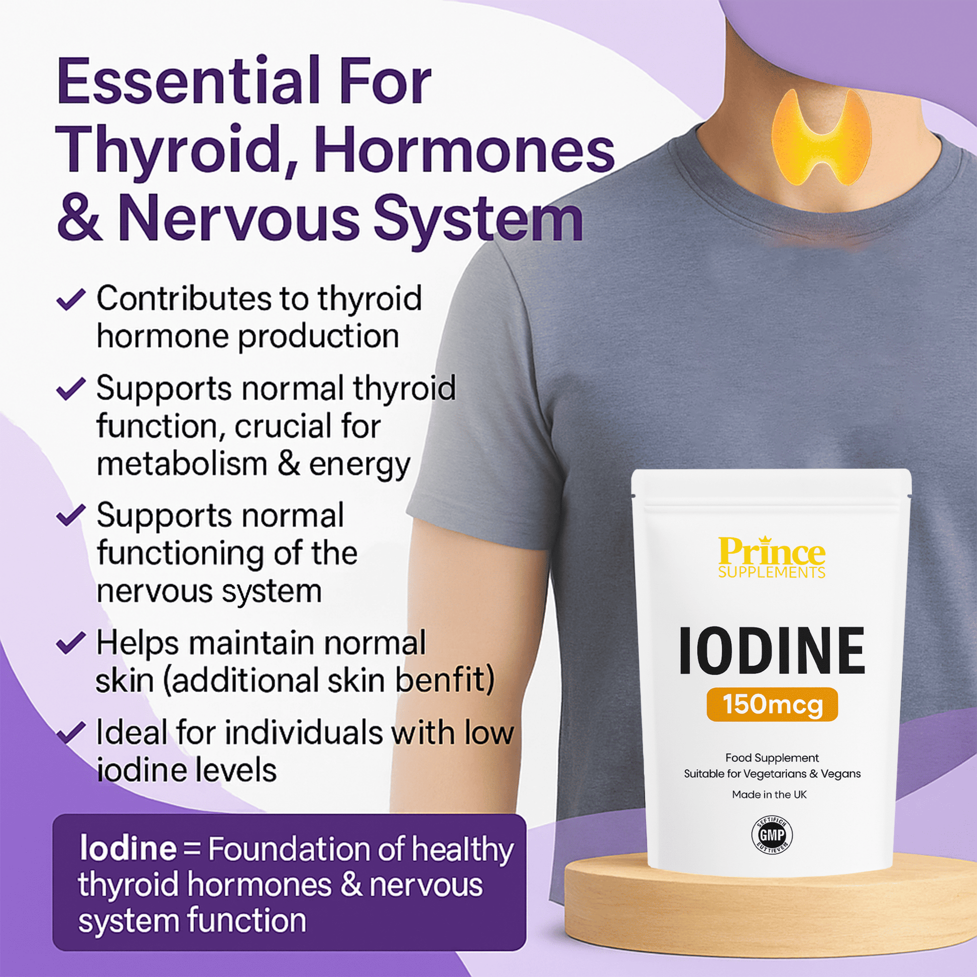 The Thyroid gland needs iodine to make hormones. Our supplement is suitable for people who have low levels of iodine.