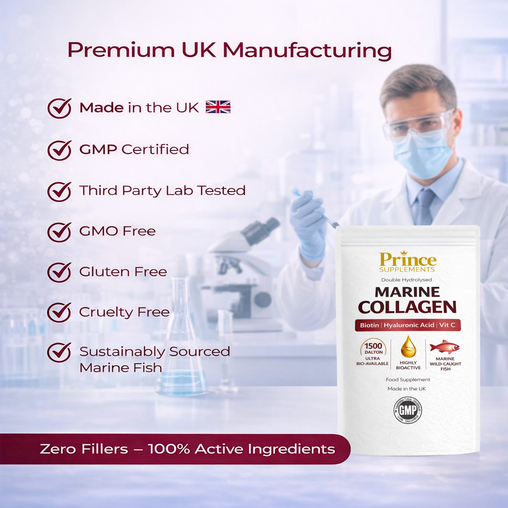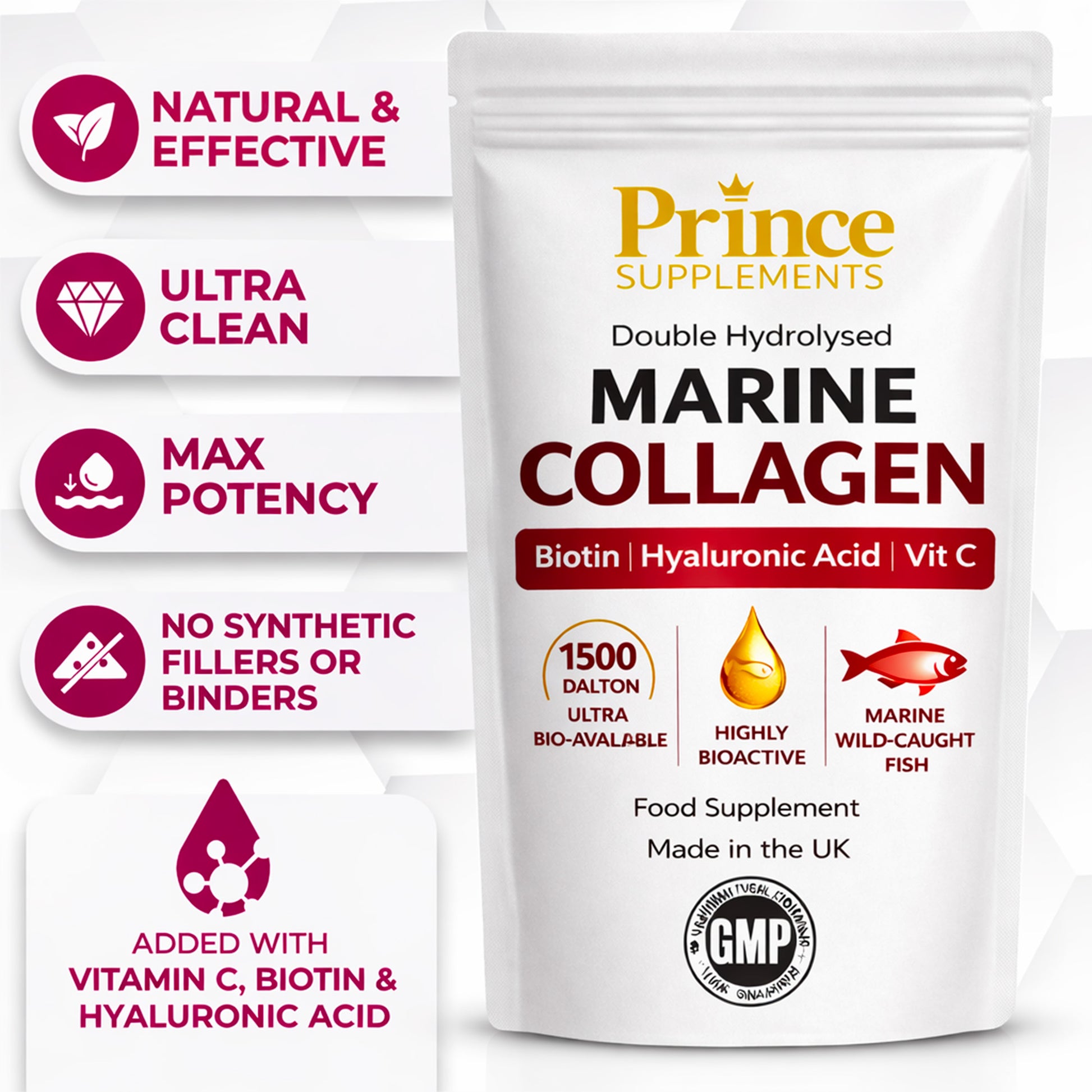 Our Double Hydrolysed Marine Collagen is designed for maximum absorption and effectiveness. With a low molecular weight (1500 Dalton), this formula ensures superior bioavailability for faster results.