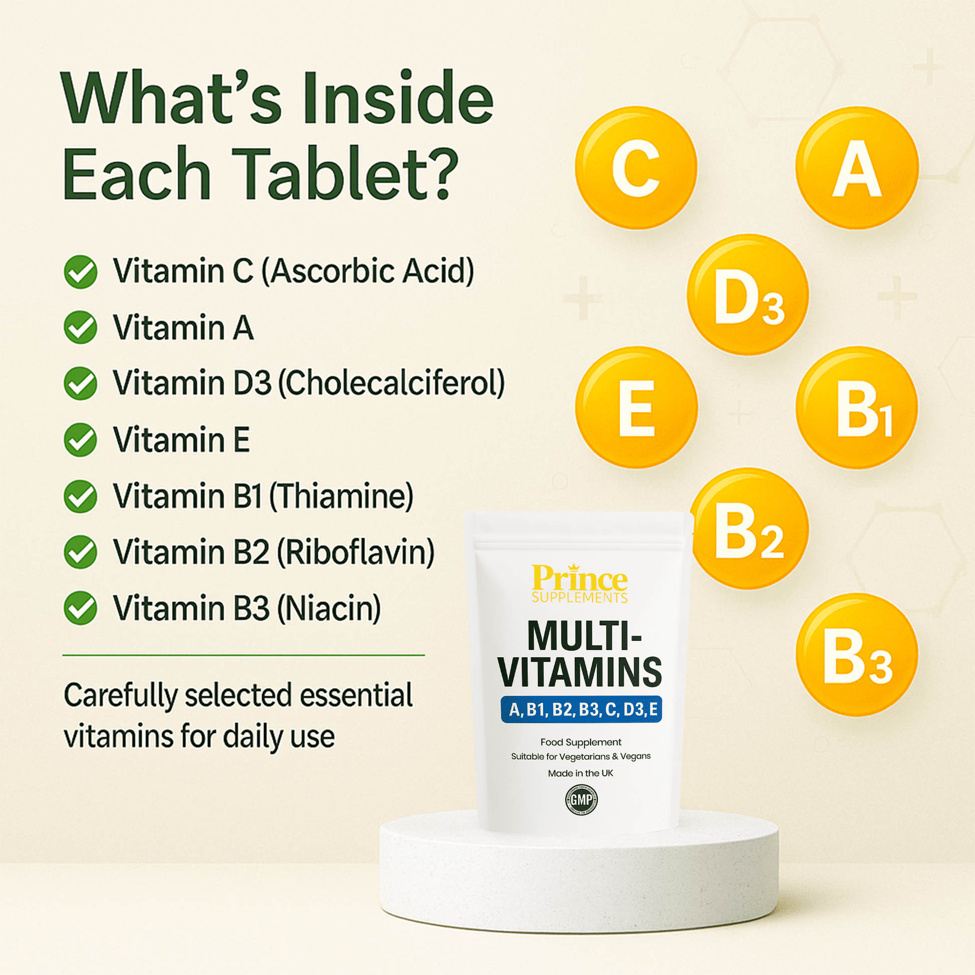 Vitamin C (Ascorbic Acid), Vitamin B2 (Riboflavin), Vitamin A, Vitamin B3 (Niacin), Vitamin D3 (Cholecalciferol), Vitamin E, Vitamin B1 (Thiamine)